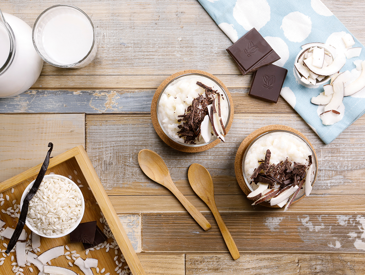 Budino cremoso al riso con latte di cocco e cioccolato al cucchiaio