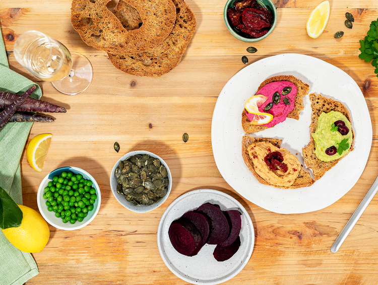 Hummus di ceci arricchito con piselli, barbabietola e pomodorini secchi, servito su croccanti fette di fresella. Una gustosa variante di tre hummus diversi, perfetta per stupire i tuoi ospiti con un antipasto colorato e ricco di sapori. Le star indiscusse di queste tre deliziose salse sono i ceci accuratamente selezionati da il Viaggiator Goloso®: piccoli legumi pregiati ricchi di sapore, 100% made in Italy, provenienti da coltivazioni biologiche.