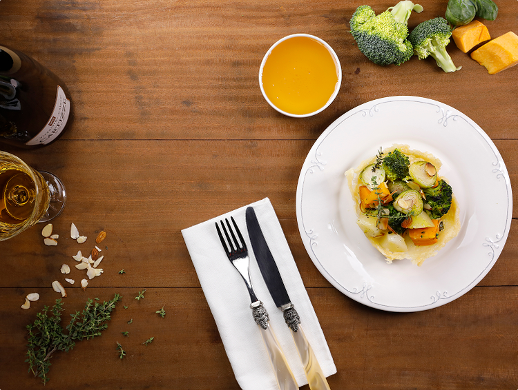 - Prendi il formaggio grana e mettilo sulla parte esterna di una ciotola per dargli la forma di un cestino. Lascialo raffreddare. Ripeti l'operazione con gli altri ingredienti fino a esaurirli.