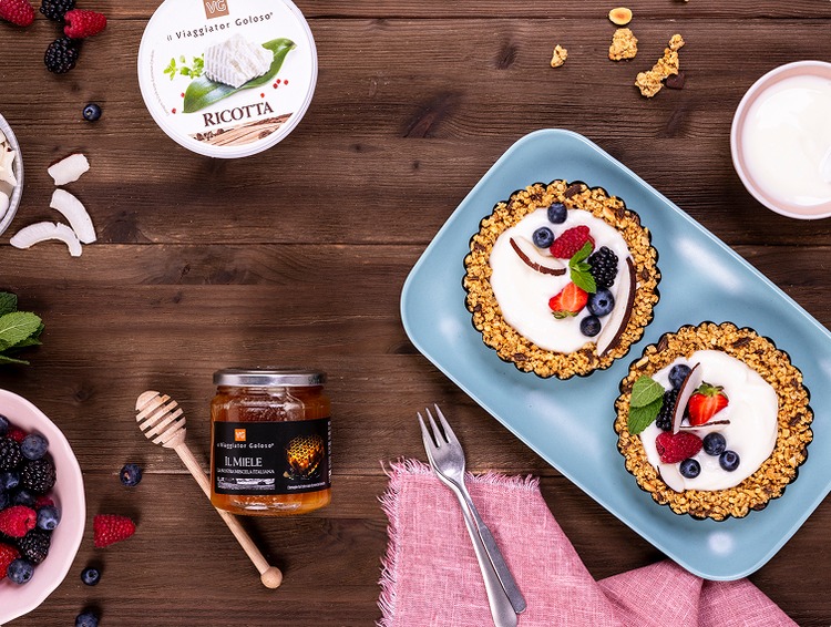 Un dessert semplice e irresistibile, perfetto per la colazione, uno snack goloso o come dolce a fine pasto. Per la realizzazione abbiamo optato per la granola arricchita con cioccolato fondente e nocciole del marchio il Viaggiator Goloso®, un prodotto nutriente e gustoso, ricco di vitamine e ferro. Perfetto da abbinare a latte e yogurt, è ideale per creare le basi delle nostre crostatine e accogliere una farcitura morbida e fresca a base di yogurt e ricotta.