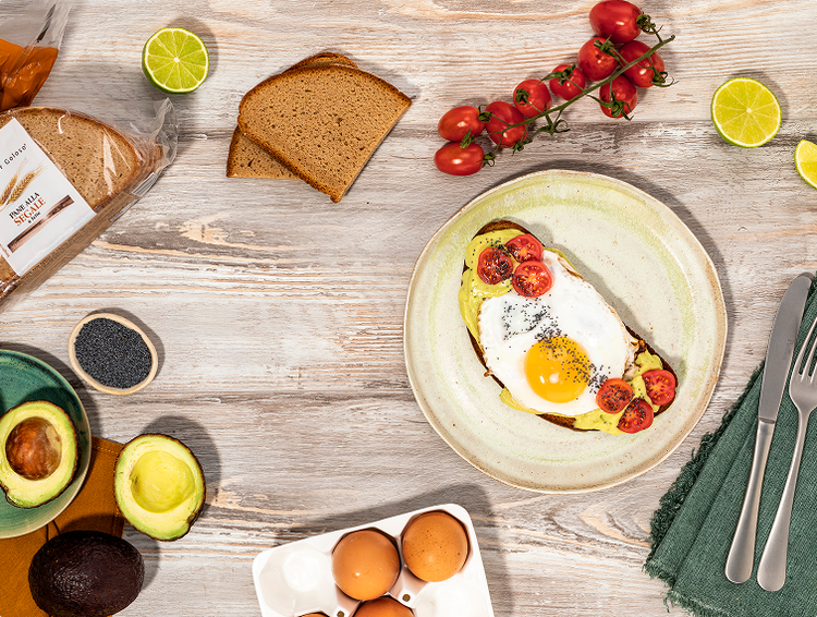 - Spalma generosamente il burro profumato sulle fette di pane, adagiaci sopra le uova, aggiungi pomodorini a fettine e una manciata di semi di papavero per un tocco di croccantezza.