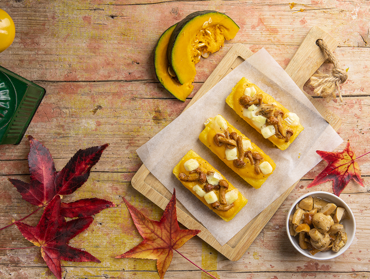 Crostoni di polenta con crema di zucca, funghi e brie