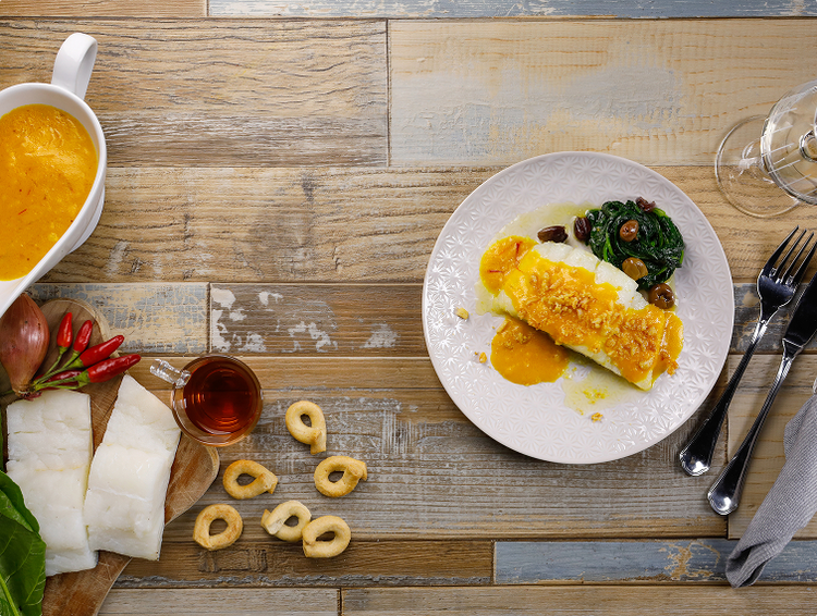 - Servi il baccalà con la salsa allo zafferano e le bietole saltate con le olive taggiasche. Un piatto che conquisterà tutti i palati!