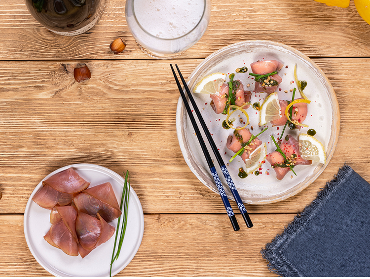 - Per servire il carpaccio di tonno affumicato, aggiungi una deliziosa crema di basilico, fettine sottili di limone, granella di nocciole e una leggera spolverata di pepe rosa. Un mix di sapori che esalteranno il tuo piatto e delizieranno il palato.