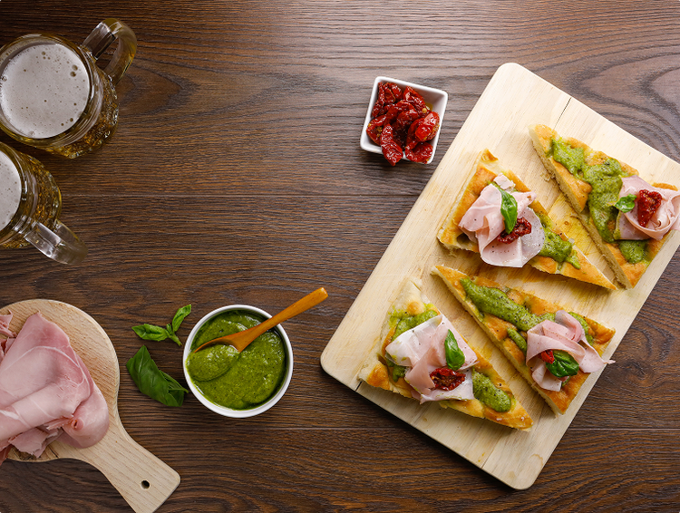 Prelibata focaccia al pesto genovese e pomodorini secchi