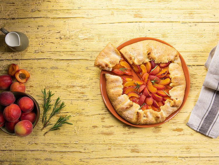 - Disporre gli spicchi di albicocche e qualche fogliolina di rosmarino sulla superficie. Sigillare i bordi e spennellare con olio extravergine di oliva. Distribuire lo zucchero sui bordi e cuocere in forno statico preriscaldato a 180° per circa 35-40 minuti.