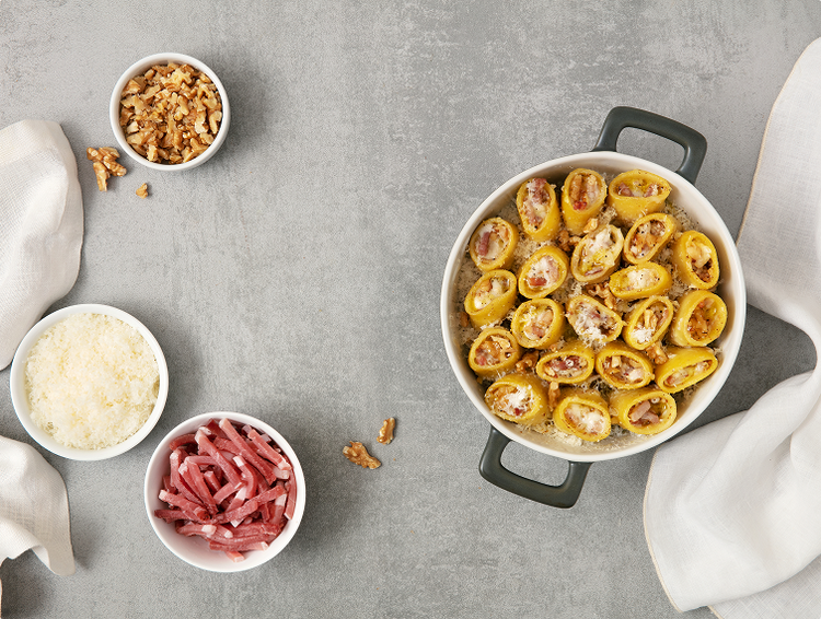 Paccheri gratinati al forno con crema di formaggio, speck e noci