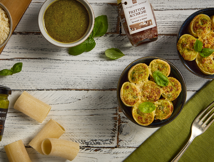 Immagina uno strato croccante di Parmigiano gratinato che si spezza al primo morso, sprofondando tra i paccheri avvolti in una delicata crema al Pesto genovese. Questa squisita specialità firmata il Viaggiator Goloso cattura in ogni boccone i sapori e i profumi dei migliori ingredienti, seguendo la ricetta tradizionale.