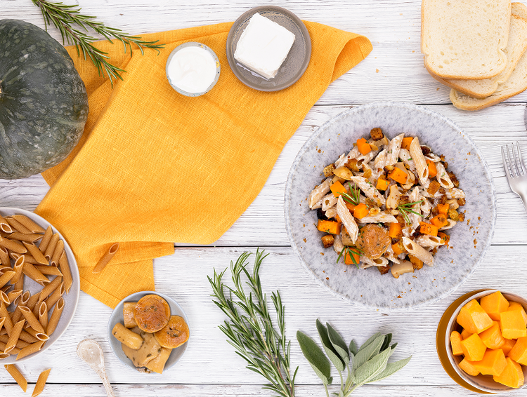 Penne integrali con vellutata di funghi porcini, robiola e zucca