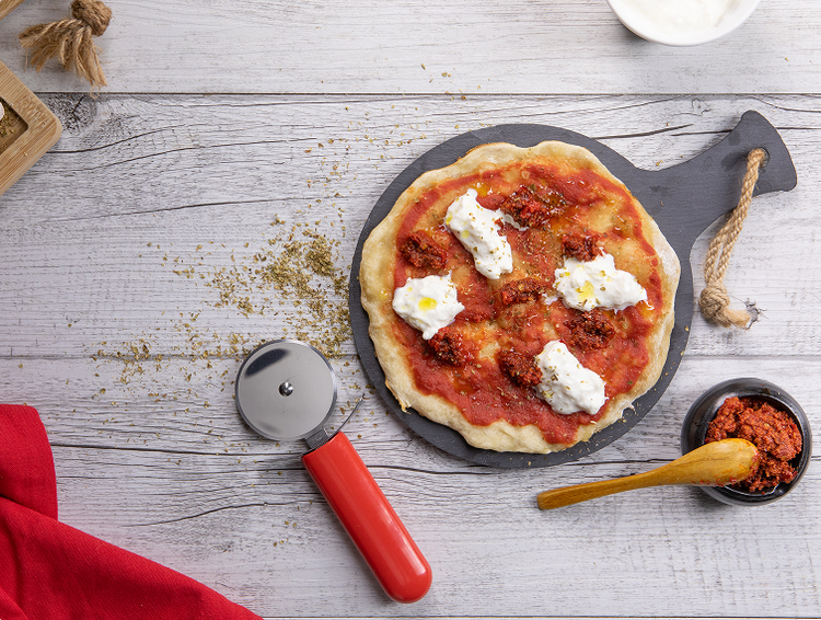 - Preleva la pizza dalla padella e aggiungi generosamente la ‘nduja, regolandoti in base al tuo gusto personale e al livello di piccantezza desiderato. Accompagna con la stracciatella, completando il piatto con una spolverata di origano e un filo d'olio.