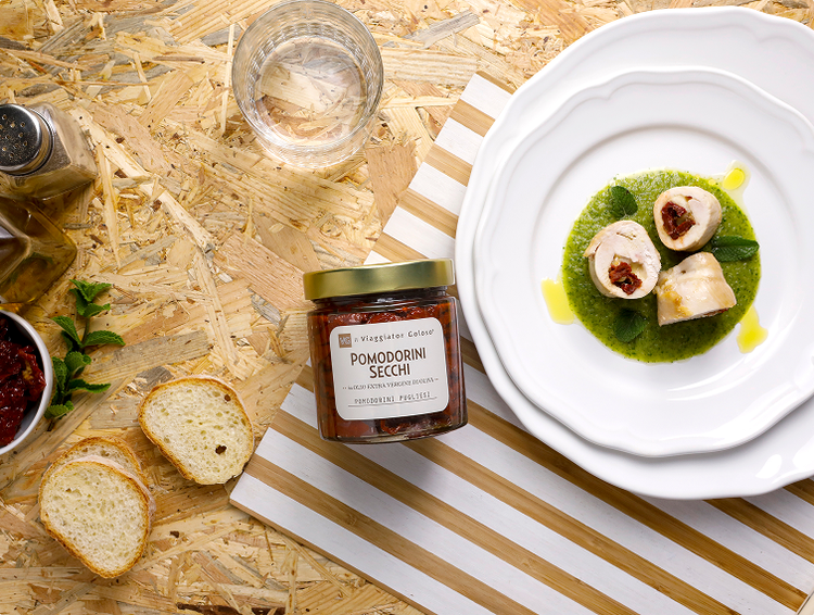 Hai mai provato il delizioso rollè di petto di pollo con pomodorini secchi? I deliziosi pomodorini secchi sott’olio marchiati il Viaggiator Goloso® regalano un sapore intenso e vivace, perfetti come antipasto per chi ama le prelibatezze. Possono trasformarsi in una farcitura gustosa per involtini a base di carne e pesce. Il rollè di petto di pollo, cotto in padella e tagliato a fette, si sposa alla perfezione con una crema fresca di zucchine dal tocco di menta.