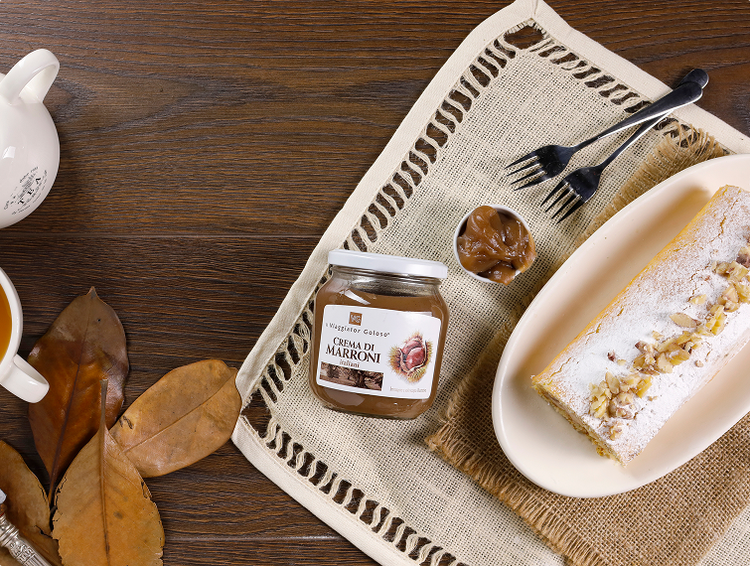 Scopri il piacere dell'autunno con questo delizioso rotolo alla crema di marroni e panna. Questa deliziosa ricetta prevede l'utilizzo della crema di marroni firmata il Viaggiator Goloso®, realizzata con castagne italiane al 100%. La base di pan di Spagna viene arricchita da questa eccezionale crema unita alla panna fresca, conferendo al dolce un sapore unico e avvolgente. Per rendere ancora più speciale il risultato finale, le morbide castagne vengono aggiunte sia nel ripieno che nella decorazione.