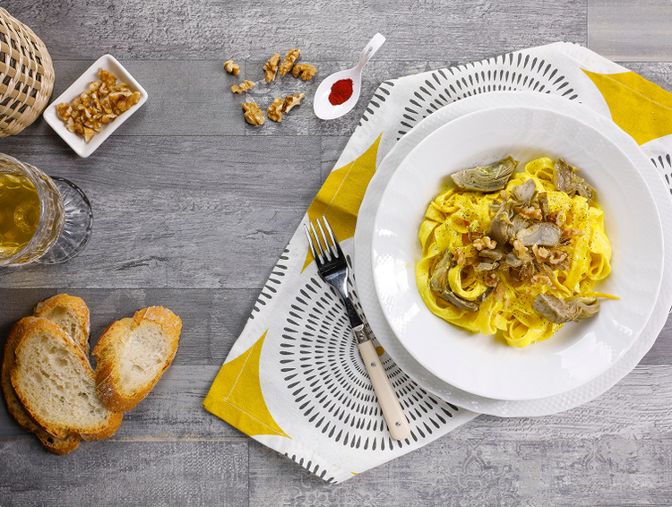 Tagliatelle con ricotta cremosa allo zafferano, carciofi croccanti e noci