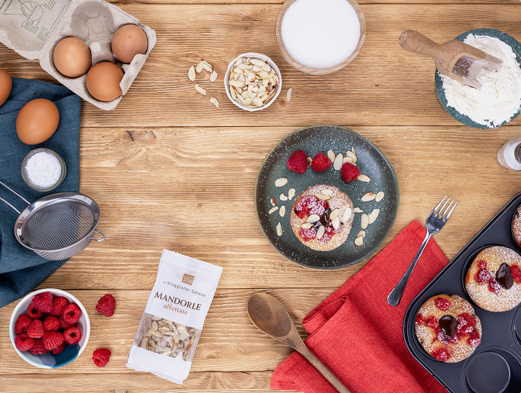 Muffin con farina di nocciole e yogurt, lamponi e mandorle croccanti